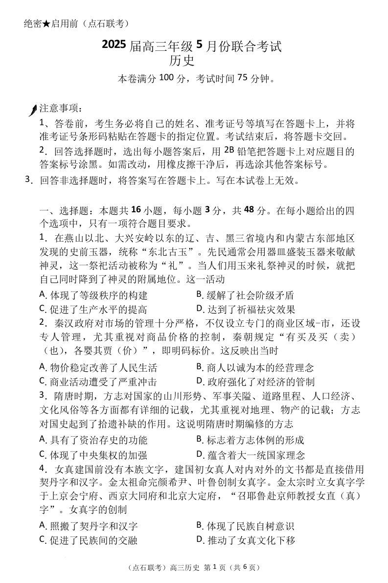 辽宁省点石联考2025届高三年级5月联合考试 历史.docx