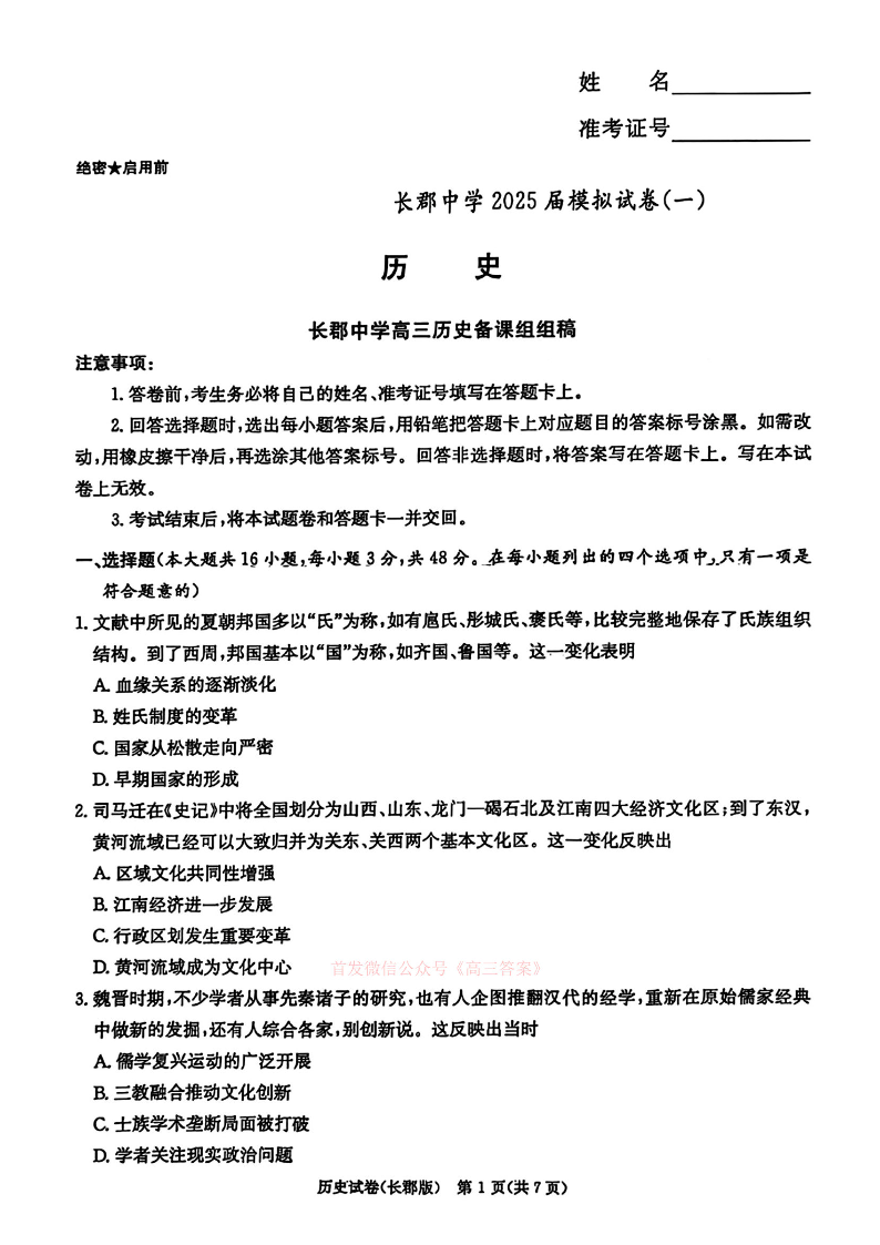 湖南省长郡中学2025届模拟试卷(一)历史(含答案).pdf
