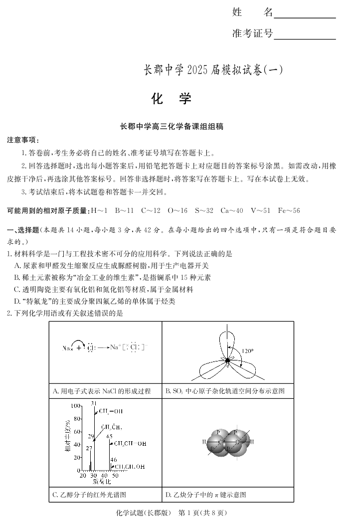 湖南省长郡中学2025届模拟试卷(一)化学(含答案).pdf