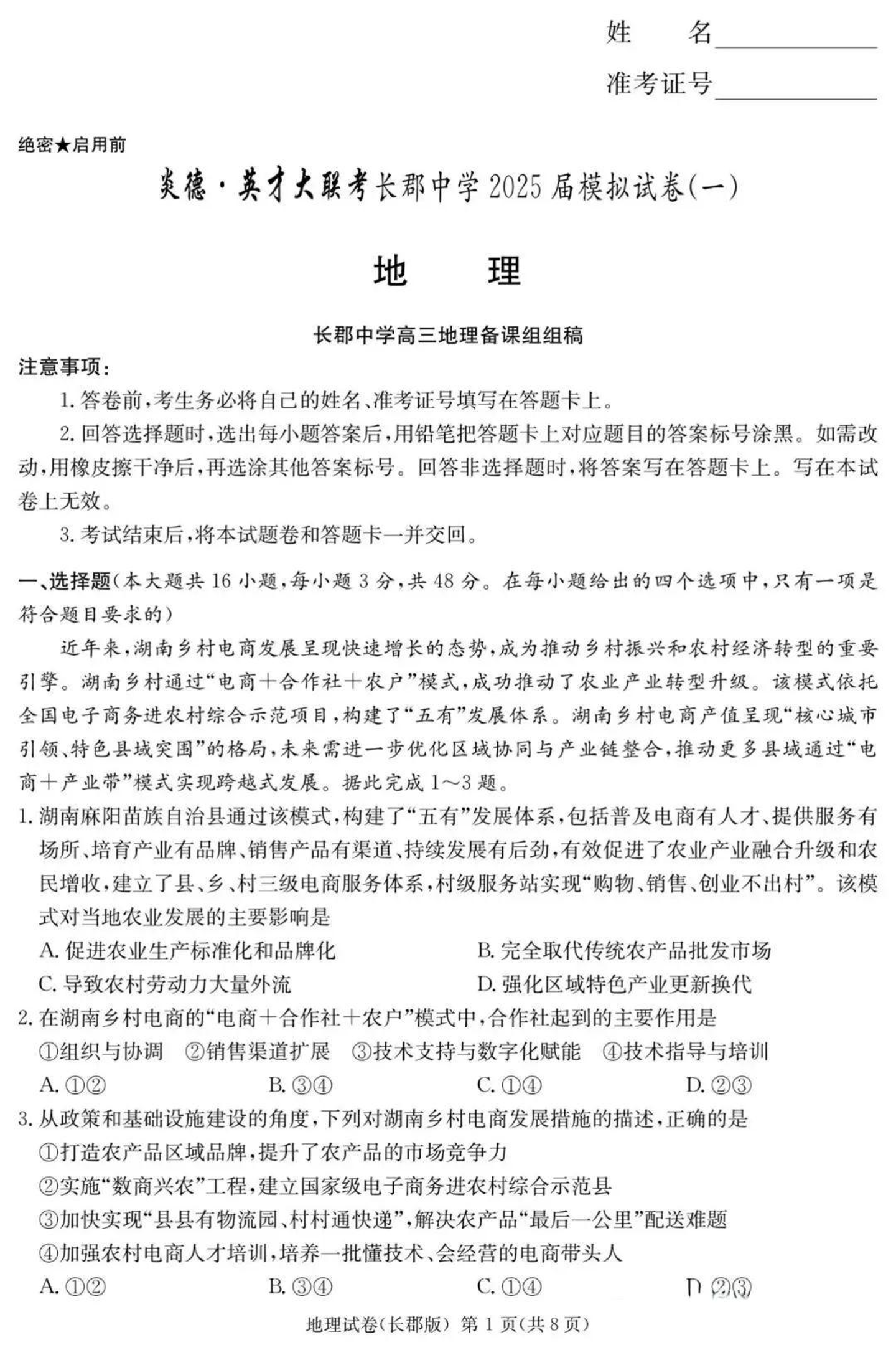 湖南省长郡中学2025届模拟试卷(一)地理(含答案).pdf