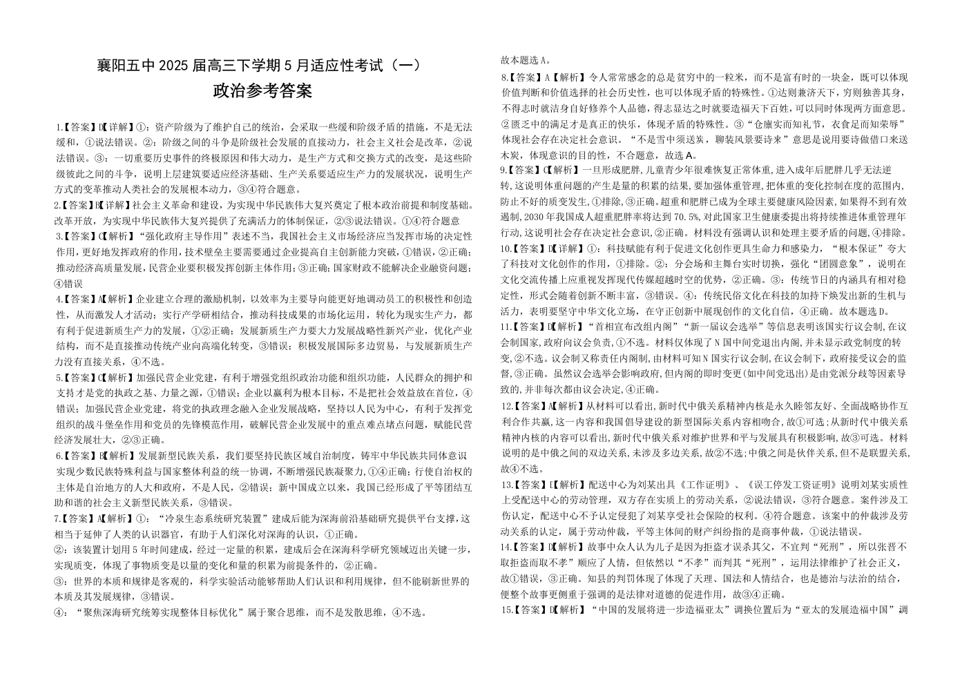 襄阳五中2025届高三下学期5月适应性考试(一)政治答案.docx