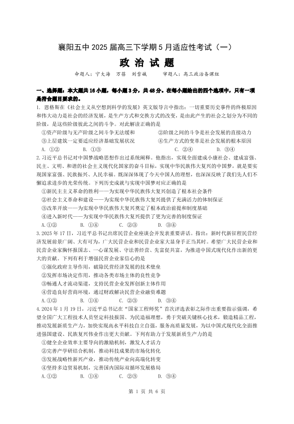 襄阳五中2025届高三下学期5月适应性考试(一)政治.pdf