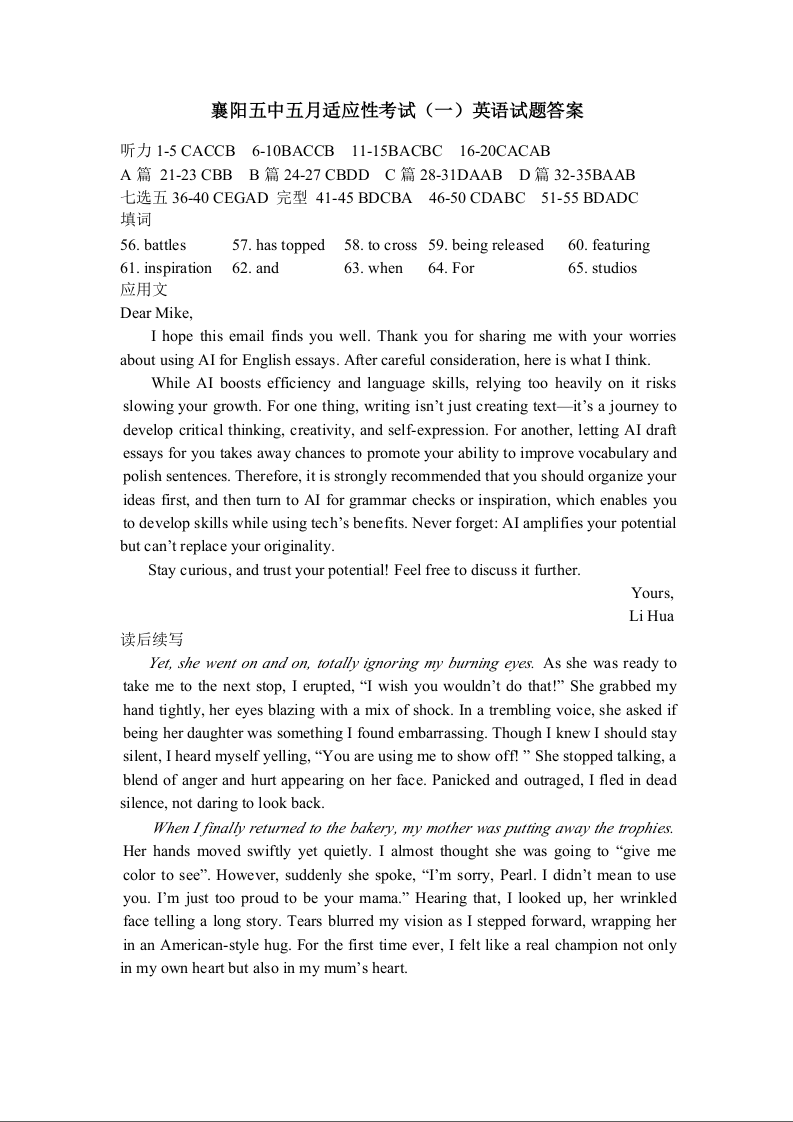 襄阳五中2025届高三下学期5月适应性考试(一)英语答案.docx
