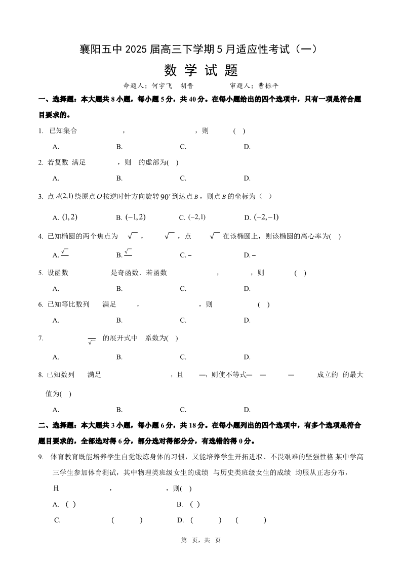 襄阳五中2025届高三下学期5月适应性考试(一)数学.pdf