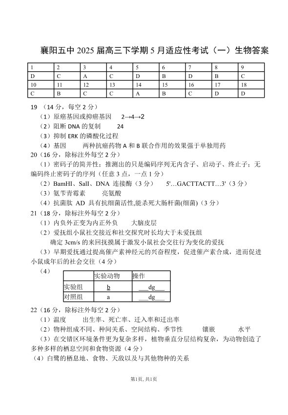 襄阳五中2025届高三下学期5月适应性考试(一)生物答案.pdf