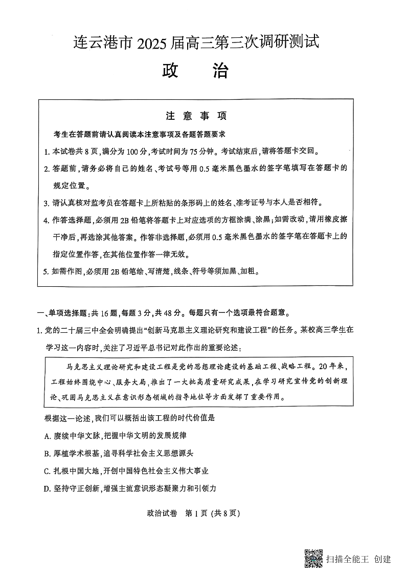 江苏省南通市2025届高三第三次调研暨苏北七市调研 政治(含答案).pdf
