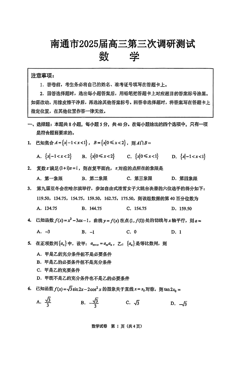 江苏省南通市2025届高三第三次调研暨苏北七市调研 数学(含答案).pdf