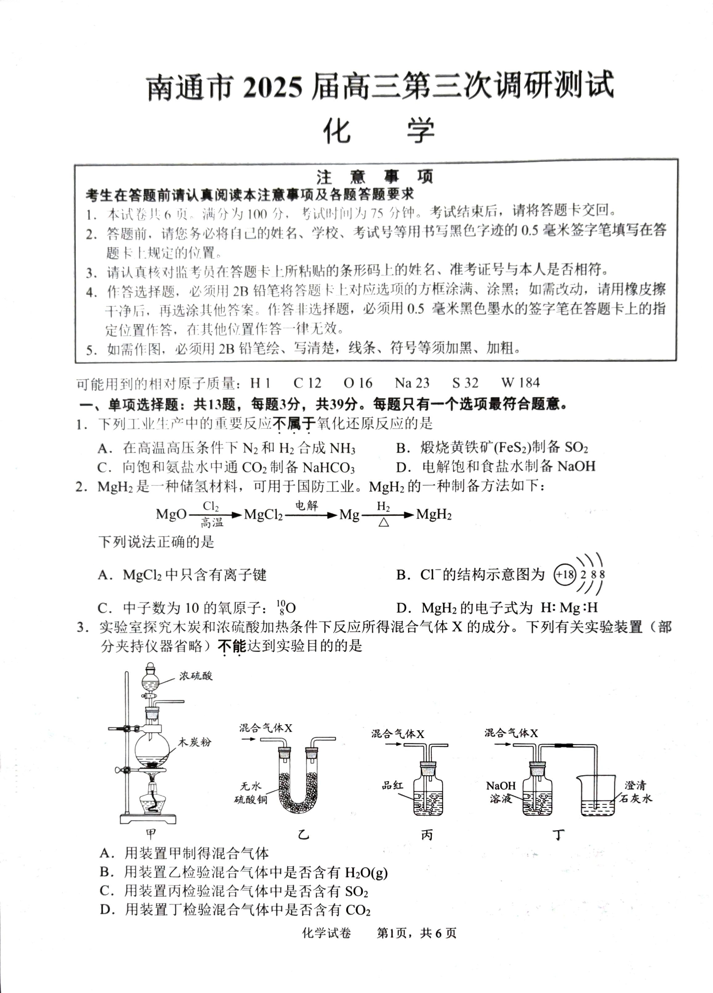江苏省南通市2025届高三第三次调研暨苏北七市调研 化学(含答案).pdf