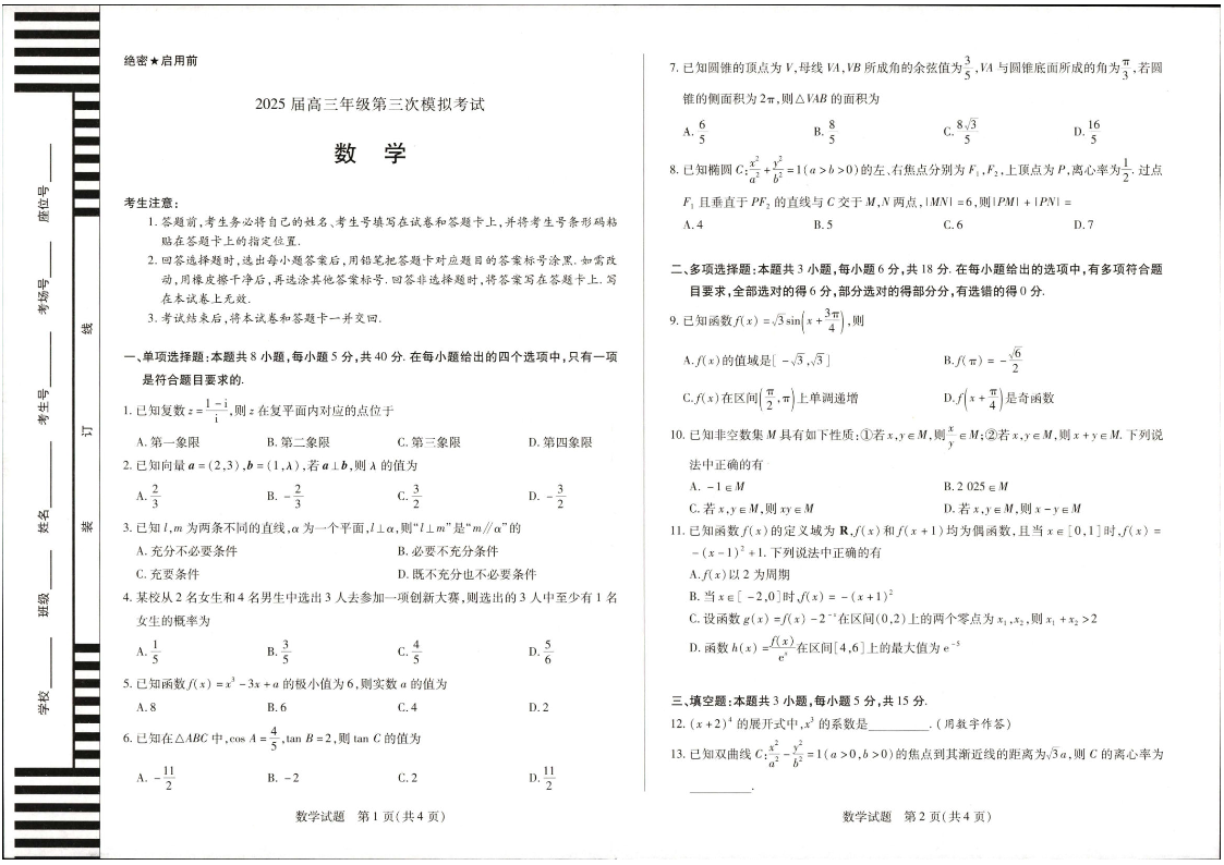 河南省2025届高三年级第三次模拟考试 数学.pdf