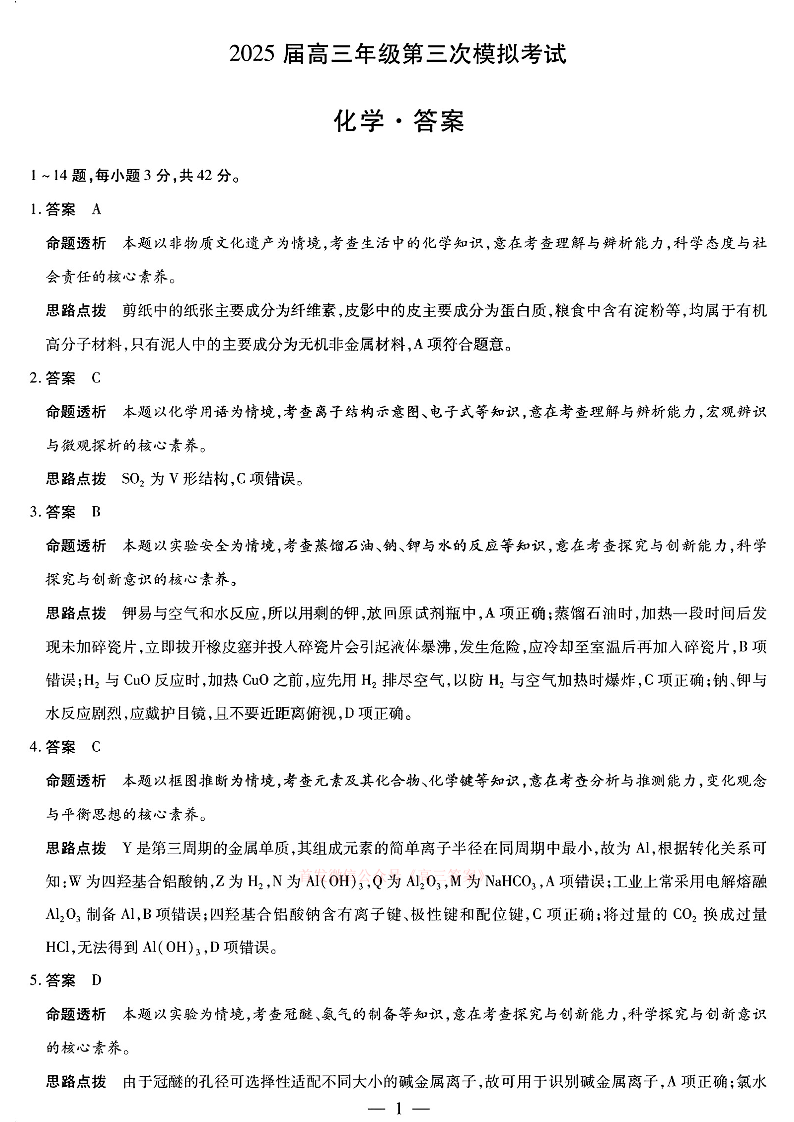 河南省2025届高三年级第三次模拟考试 化学答案.pdf