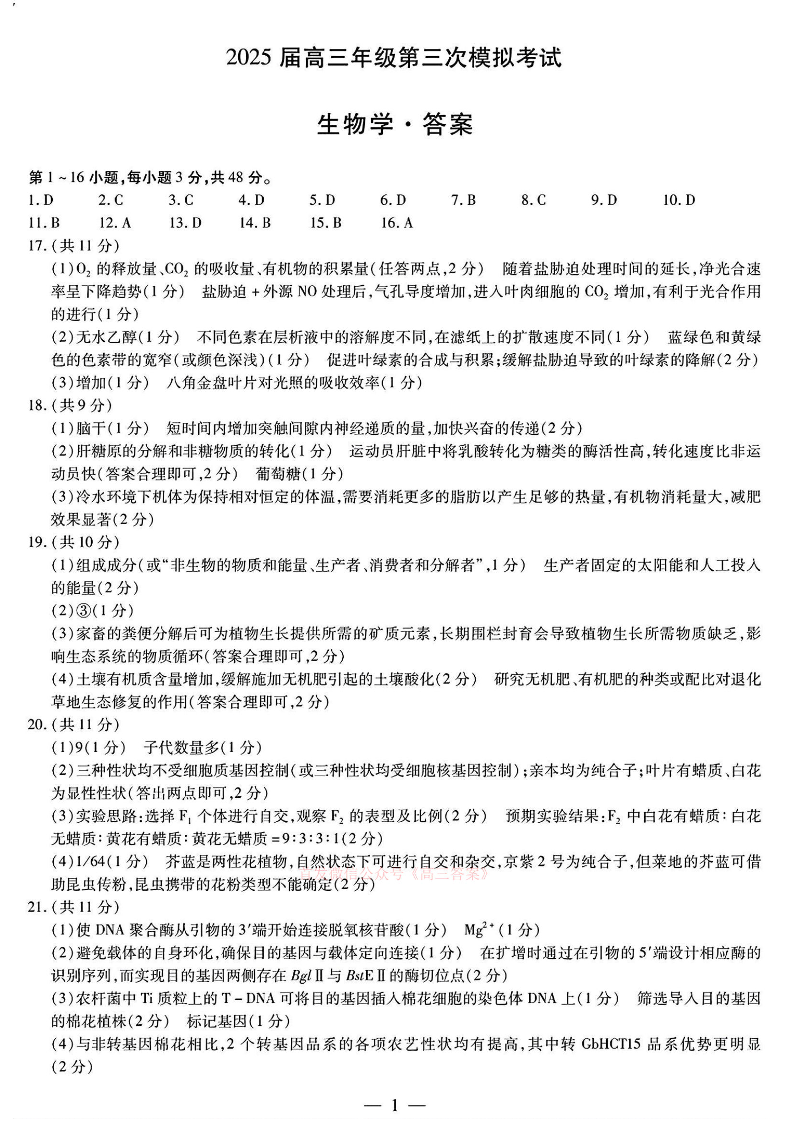 河南省2025届高三年级第三次模拟考试 生物答案.pdf
