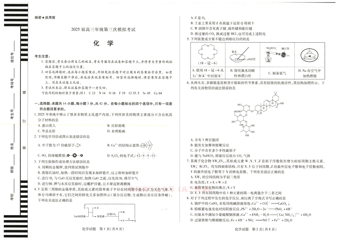 河南省2025届高三年级第三次模拟考试 化学.pdf
