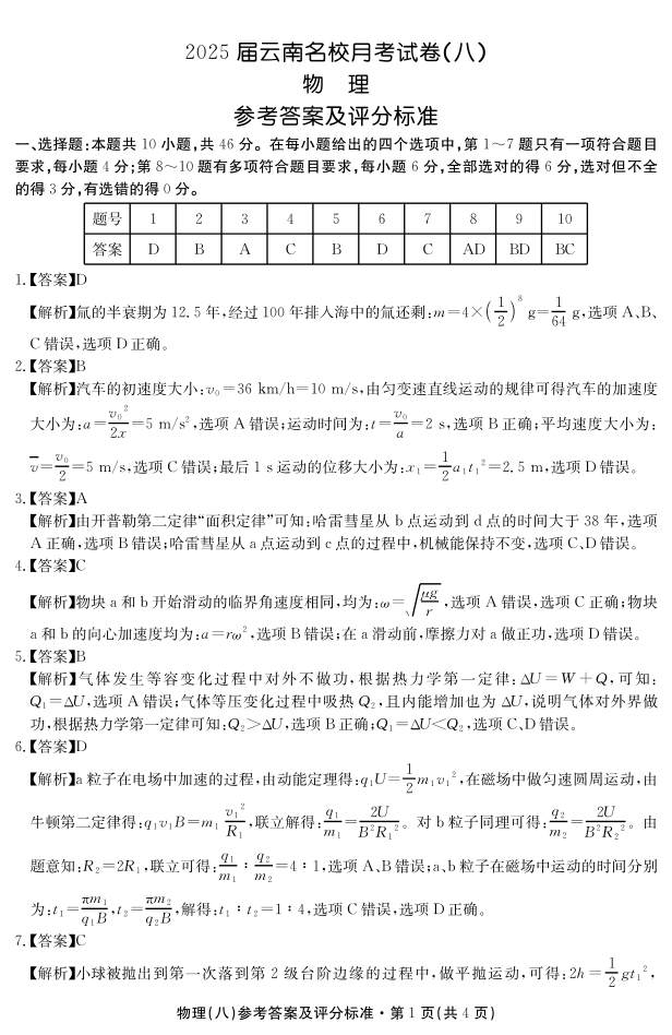 2025届云南名校月考(八)物理答案.pdf