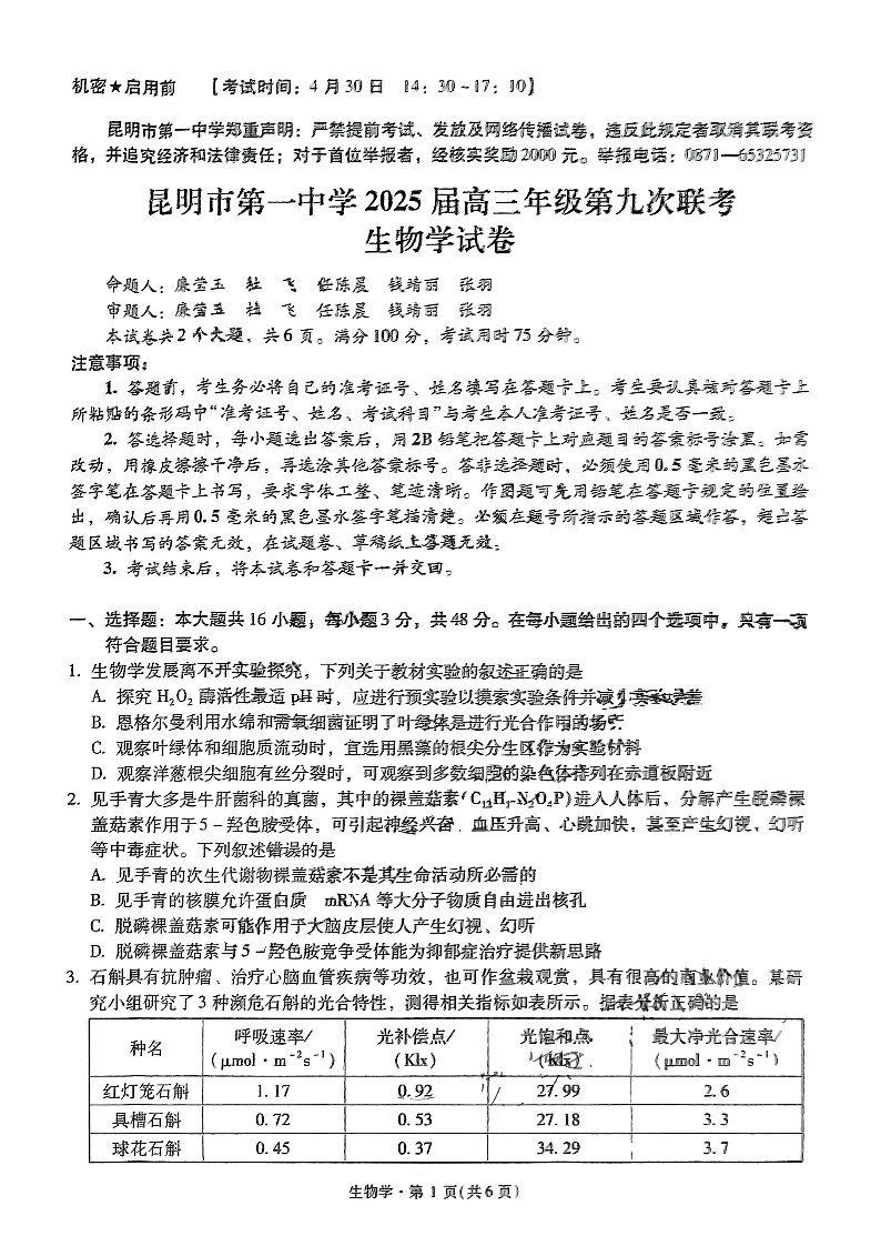 云南省昆明市第一中学2025届高三年级九次联考 生物(含答案).pdf
