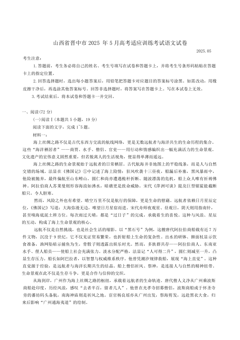 山西省晋中市2025年5月高考适应训练考试 语文(含答案).docx