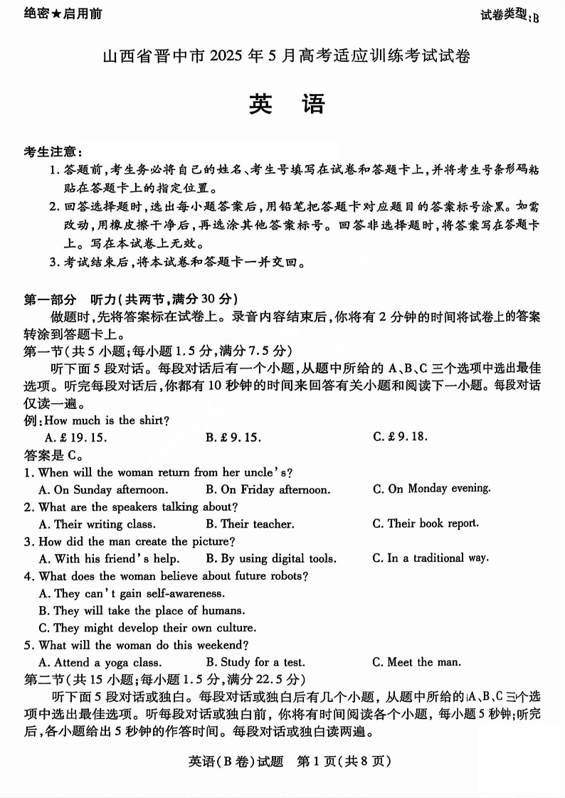 山西省晋中市2025年5月高考适应训练考试 英语.pdf