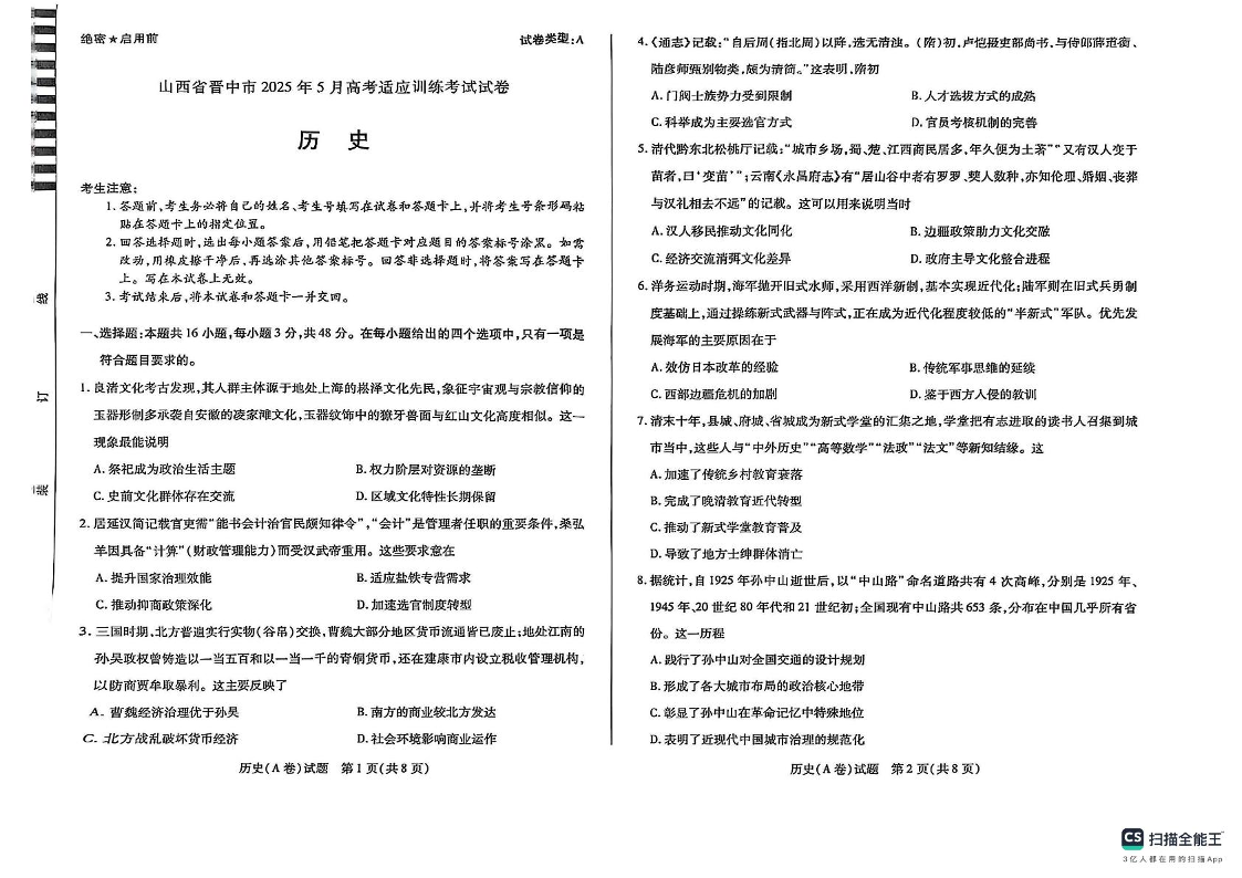 山西省晋中市2025年5月高考适应训练考试 历史.pdf