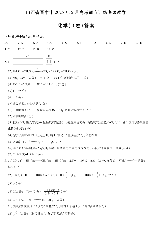 山西省晋中市2025年5月高考适应训练考试 化学答案.pdf
