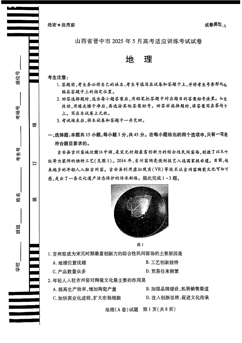 山西省晋中市2025年5月高考适应训练考试 地理(含答案).pdf
