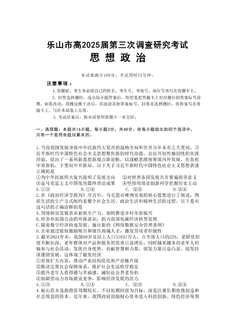 乐山市高中2025届第三次调查研究考试 政治.pdf