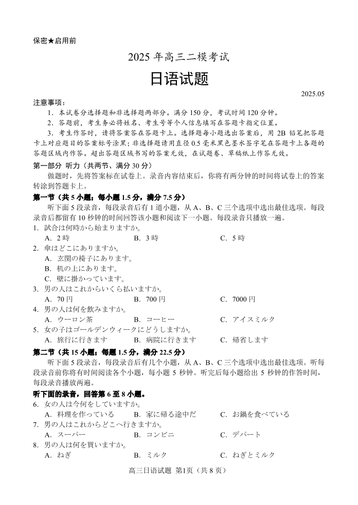 山东省菏泽市2025年高三二模考试 日语.pdf