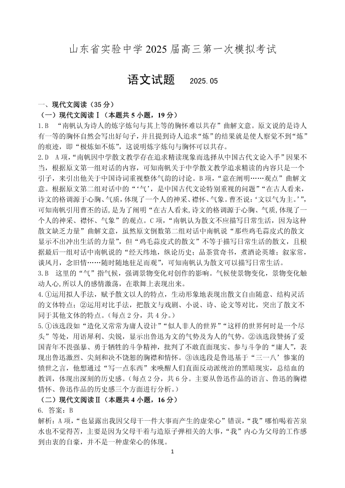 山东省实验中学2025届高三第一次模拟考试 语文答案.pdf