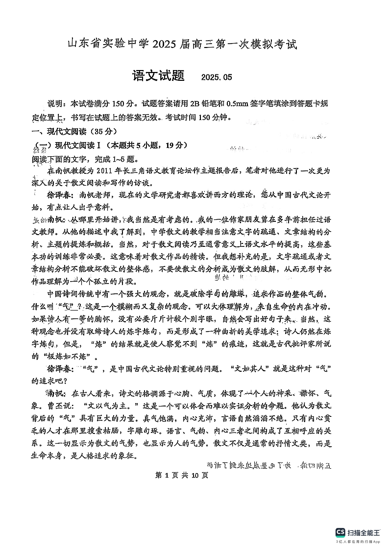 山东省实验中学2025届高三第一次模拟考试 语文.pdf