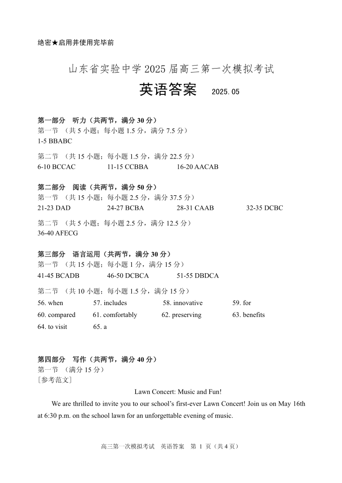 山东省实验中学2025届高三第一次模拟考试 英语答案.pdf