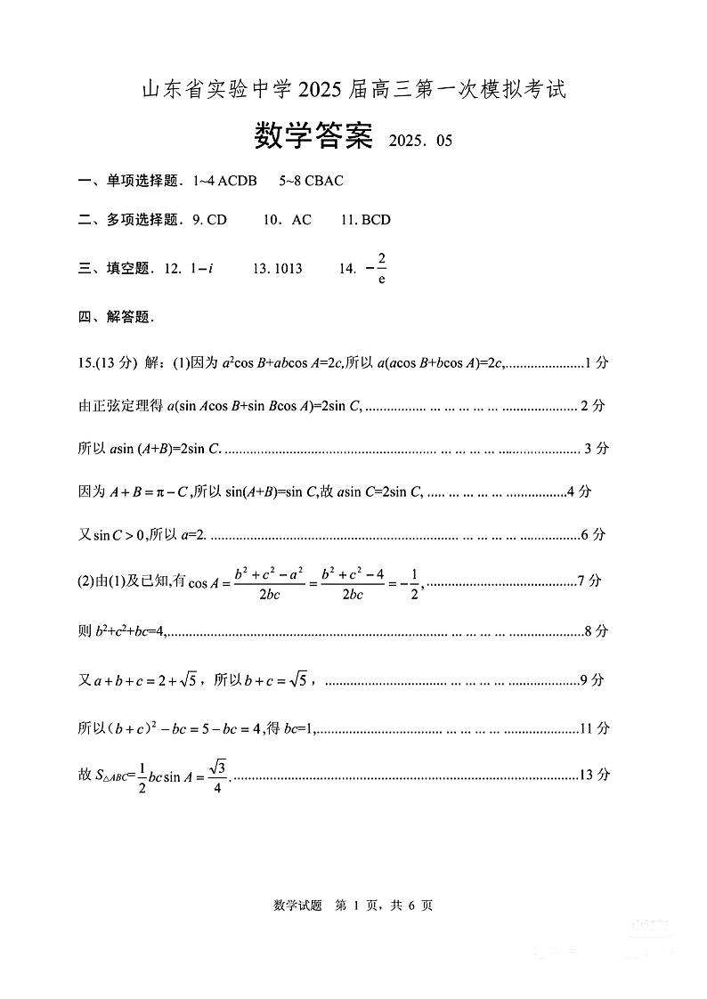 山东省实验中学2025届高三第一次模拟考试 数学答案.pdf