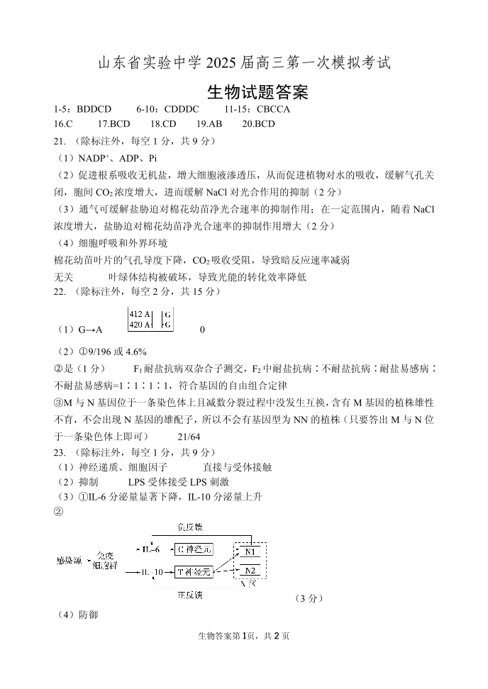 山东省实验中学2025届高三第一次模拟考试 生物答案.pdf
