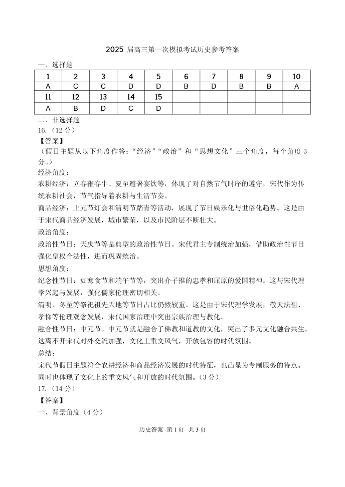 山东省实验中学2025届高三第一次模拟考试 历史答案.pdf