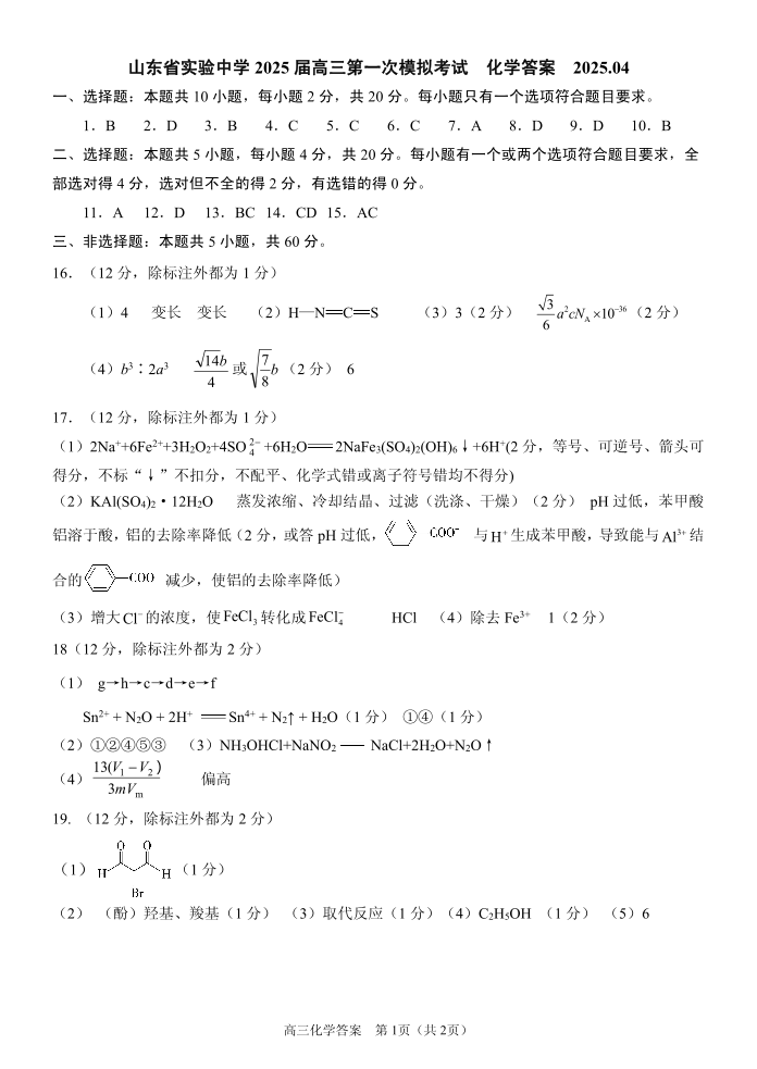 山东省实验中学2025届高三第一次模拟考试 化学答案.pdf