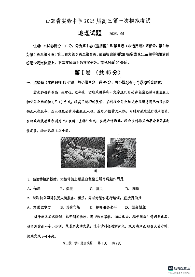 山东省实验中学2025届高三第一次模拟考试 地理.pdf
