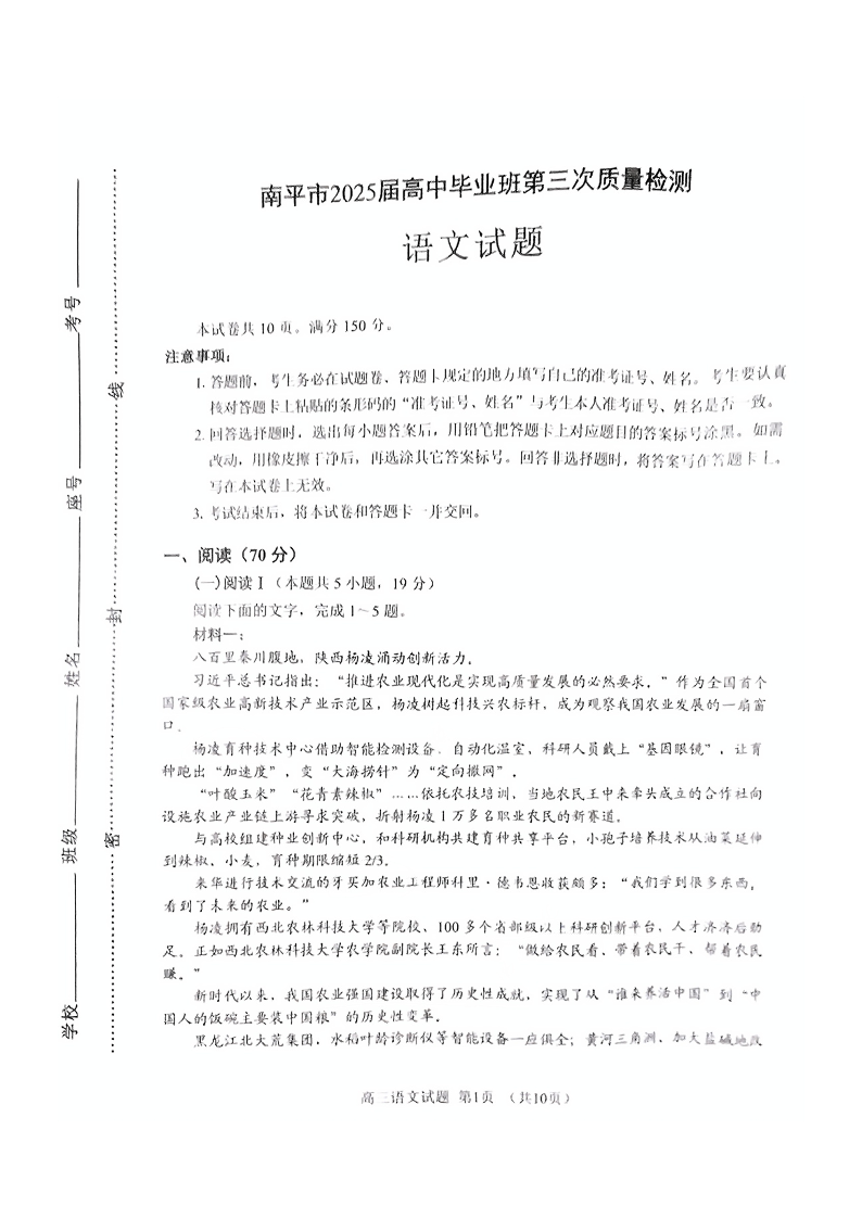 福建省南平市2025届高中毕业班第三次质量检测 语文.pdf
