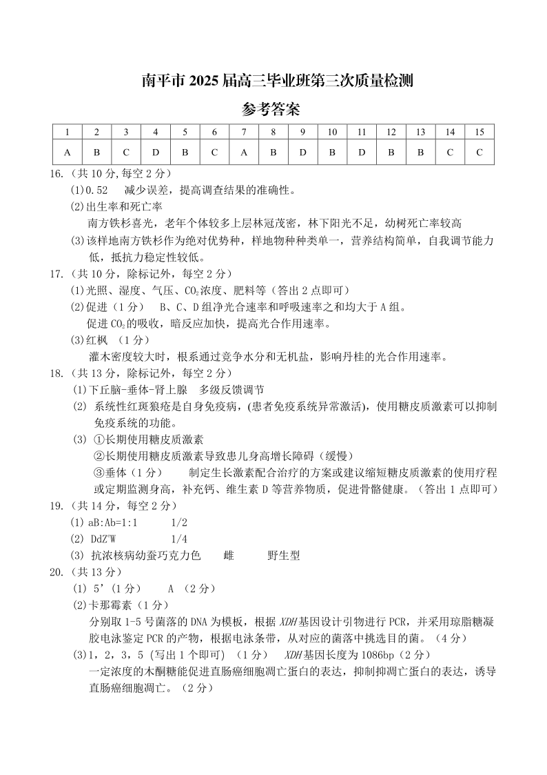 福建省南平市2025届高中毕业班第三次质量检测 生物答案.pdf