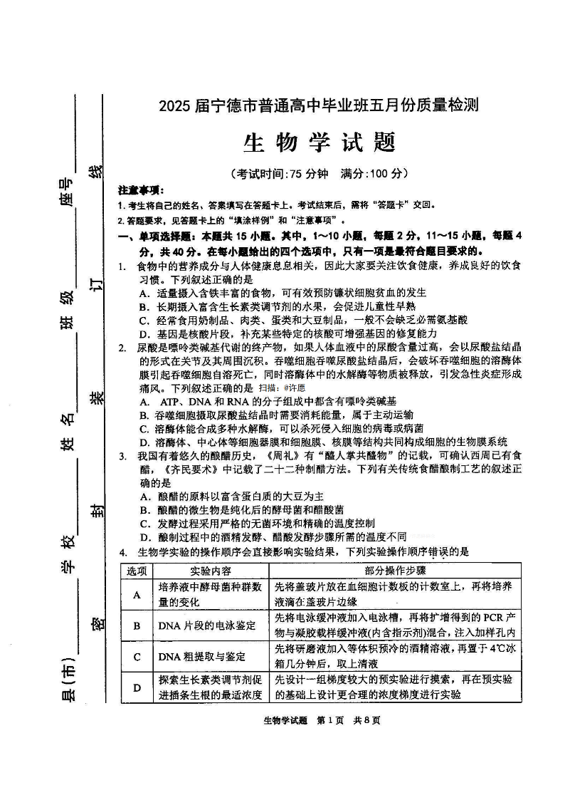 宁德市2025届普通高中毕业班五月质量检测 生物(含答案).pdf