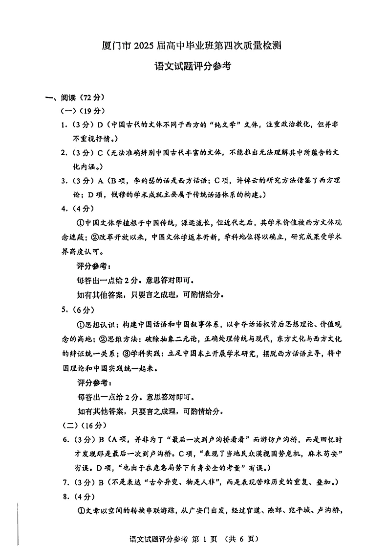 福建省厦门市2025届高中毕业班第四次质量检测 语文答案.pdf