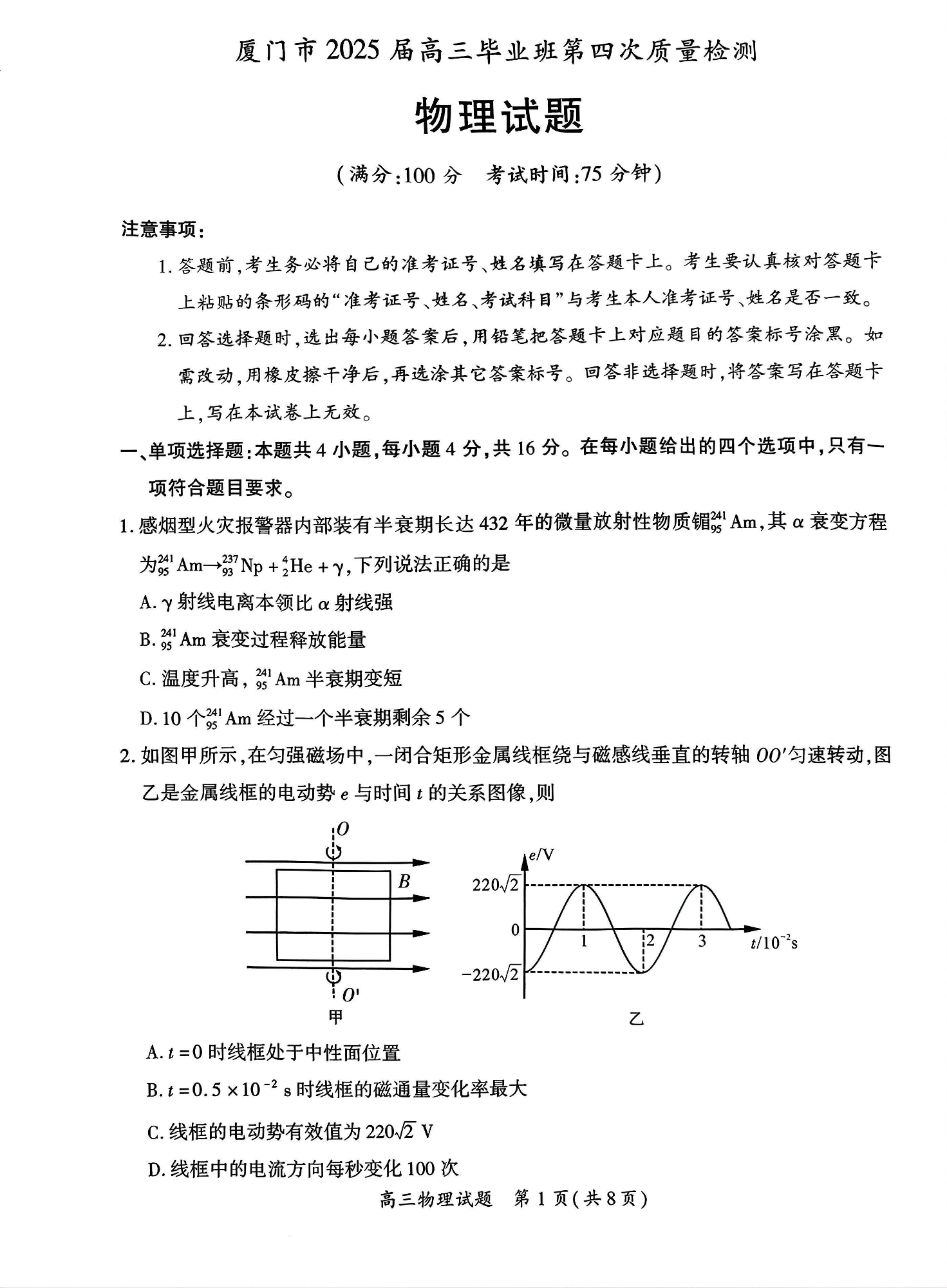 福建省厦门市2025届高中毕业班第四次质量检测 物理.pdf