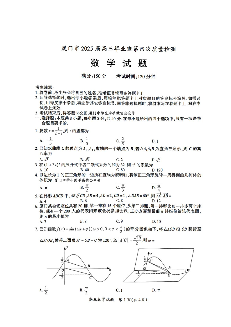 福建省厦门市2025届高中毕业班第四次质量检测 数学.pdf