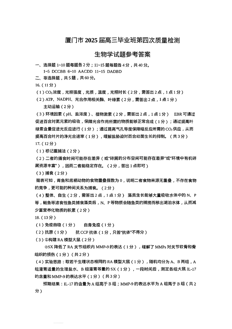 福建省厦门市2025届高中毕业班第四次质量检测 生物答案.pdf