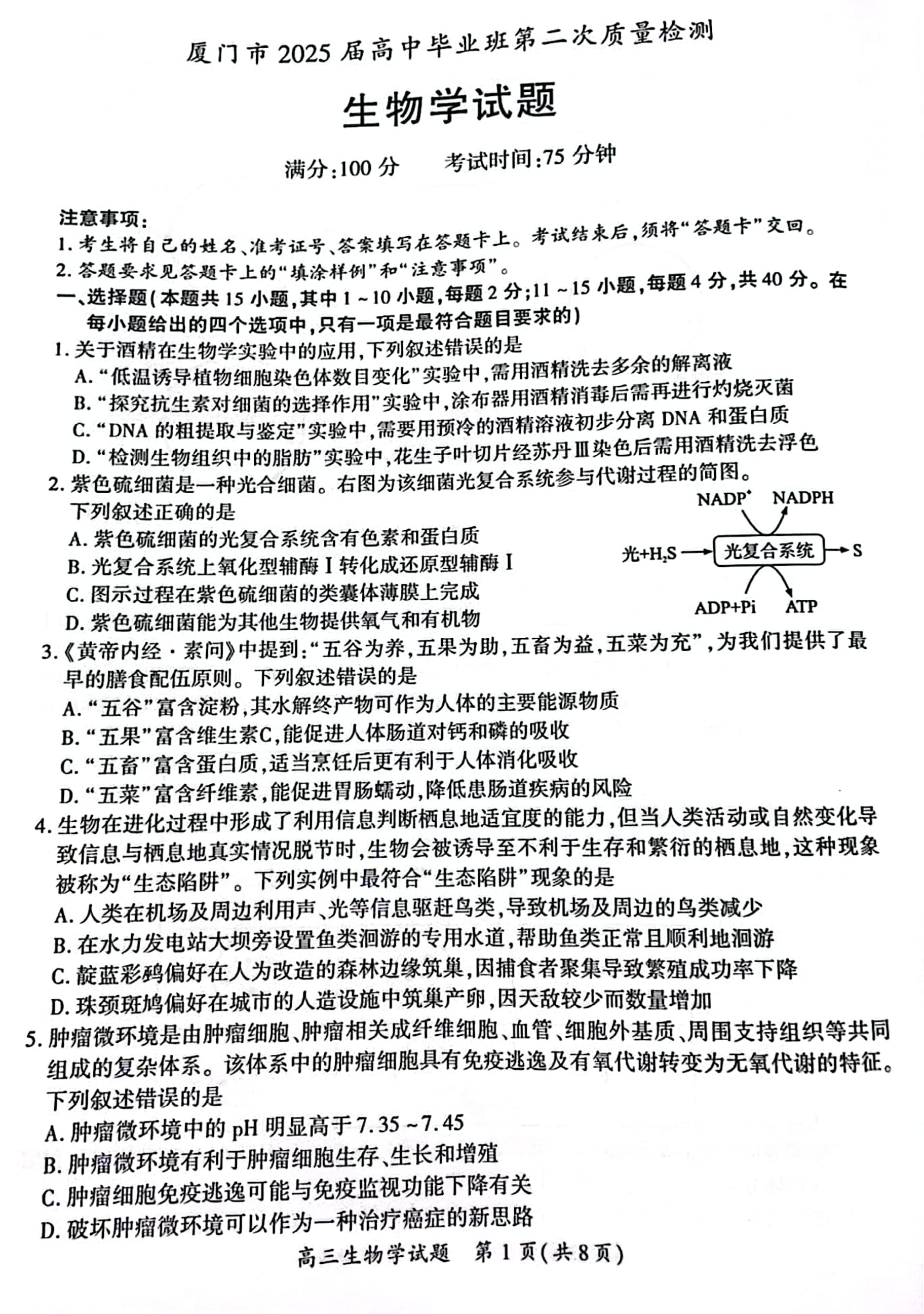福建省厦门市2025届高中毕业班第四次质量检测 生物.pdf