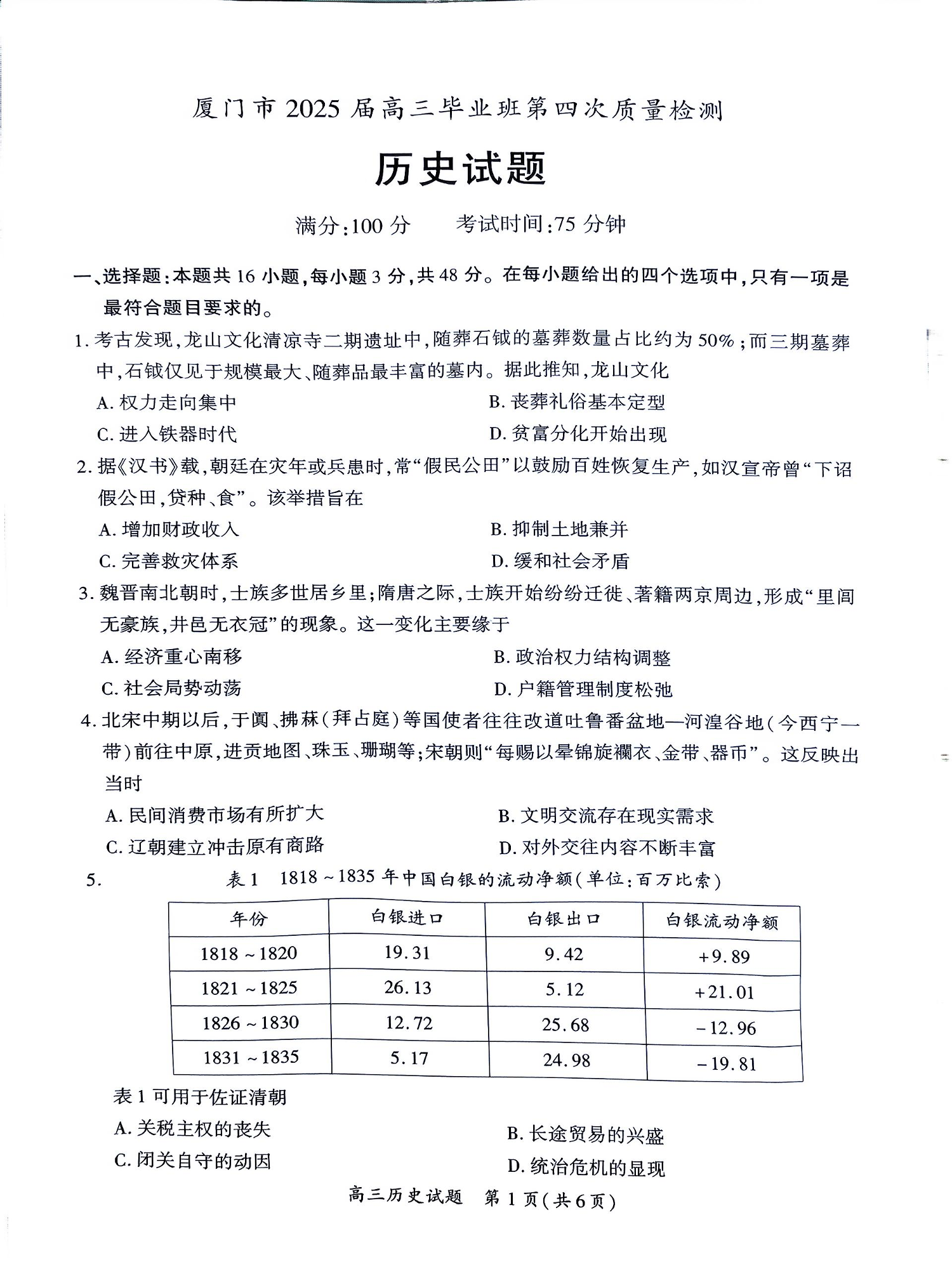 福建省厦门市2025届高中毕业班第四次质量检测 历史.pdf