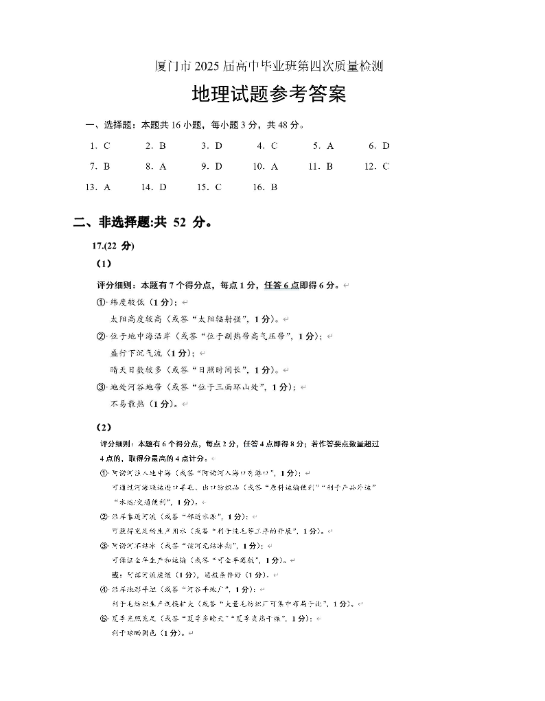 福建省厦门市2025届高中毕业班第四次质量检测 地理答案.pdf