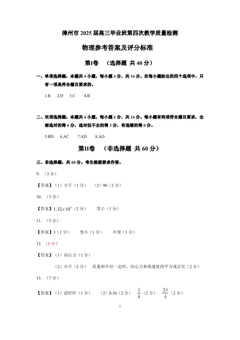 漳州市2025届高三毕业班第四次教学质量检测 物理答案.pdf