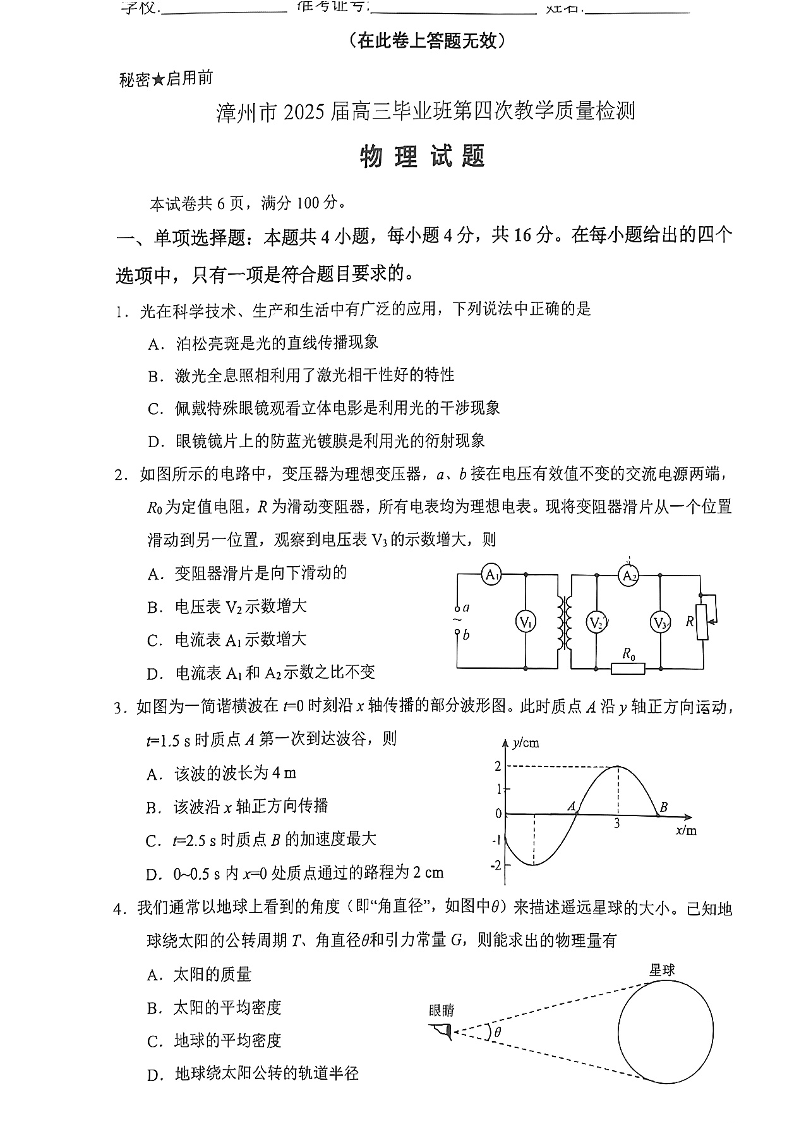 漳州市2025届高三毕业班第四次教学质量检测 物理.pdf