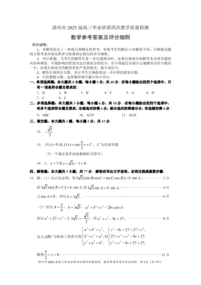 漳州市2025届高三毕业班第四次教学质量检测 数学答案.pdf