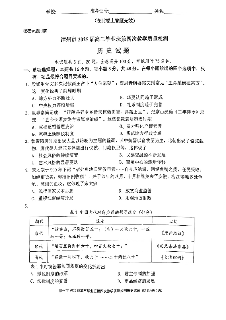 漳州市2025届高三毕业班第四次教学质量检测 历史.pdf