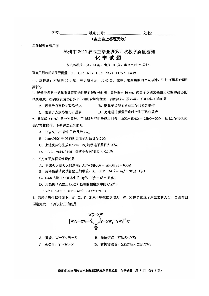 漳州市2025届高三毕业班第四次教学质量检测 化学.pdf