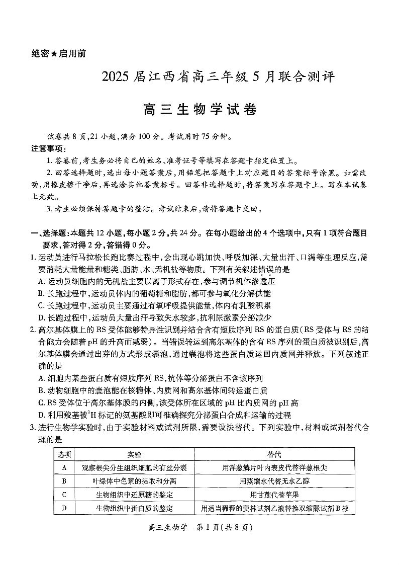 江西省上进联考2025届高三年级5月联合测评 生物.pdf