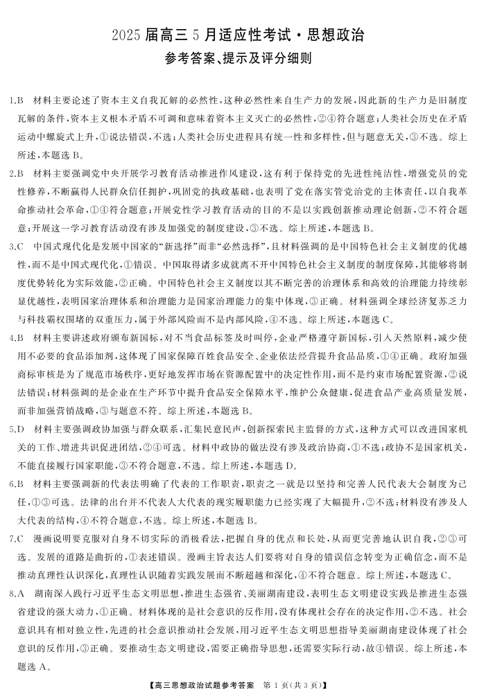 湖南省天壹名校联盟2025届高三5月适应性考试 政治答案.pdf